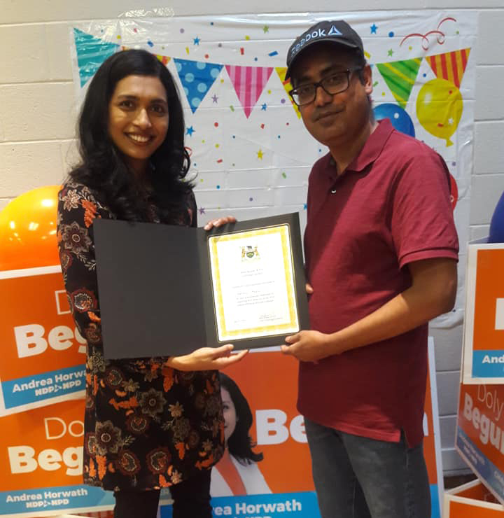 Selim Reza, the Director of RS Design Construction & Consultancy Inc., received a certificate from Doly Begum, Member of Provincial Parliament for Scarborough Southwest, ON, Canada.